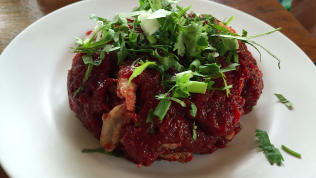 Sisi ekstrem Larb Lueat Neua i tidak hanya terletak pada bahannya yang terbuat dari daging mentah. Lo juga akan dibuat kaget dengan bahan saus kental makanan ini yang terbuat dari darah sapi.