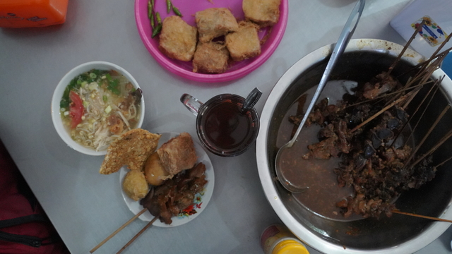 Kondimen atau pelengkap yang sudah disediakan benar-benar bikin kalap bro. Pilihannya banyak. Mulai dari perkedel, tempe goreng, tahu baso goreng, dan sate ayam kecap. Sate ayam kecap? Betul bro, dan menurut kami, sate ayam kecapnya adalah teman terbaik untuk soto ayam Pak Man.