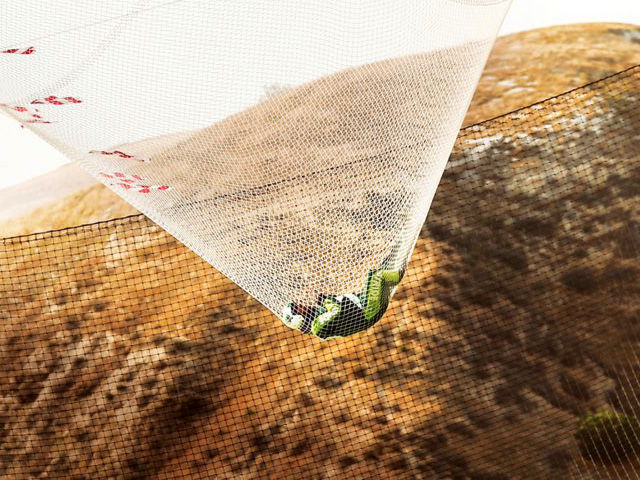 Jaring raksasa berukuran hampir sepertiga lapangan sepak bola dengan diameter 30 meter dan memiliki tinggi 60 meter menjadi satu-satunya harapan hidup Aikins.