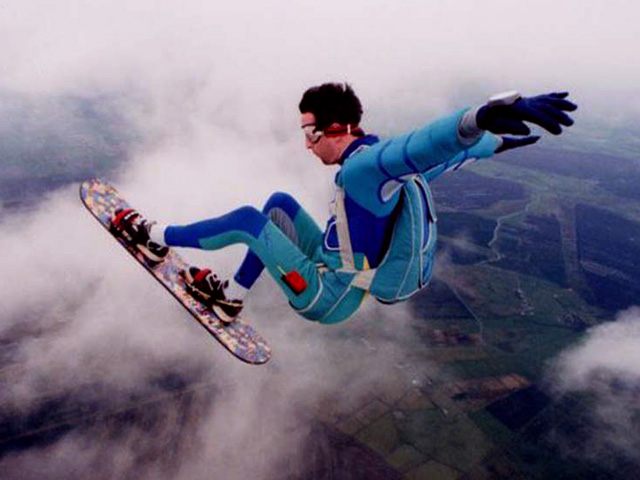 Masih olahraga udara nih bro. Skysurfing itu olahraga terjun payung pada umumnya. Bedanya, dia menggunakan item tambahan yakni papan selancar sebagai perlengkapannya. Sederhananya, semacam surfing di laut, tapi kali ini berselancar di awan. Kebayangkan serunya?