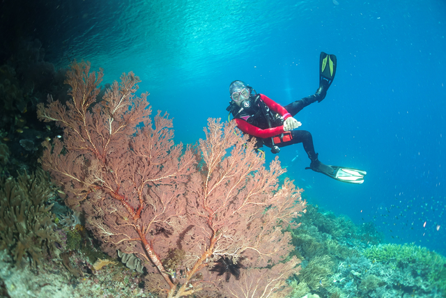 Alam bawah laut Raja Ampat yang sehat dapat terlihat dari ukuran sea fan coral yang hampir sama besarnya dengan seorang penyelam. Beberapa dive site di Raja Ampat tidak terlalu terekspos dengan arus laut yang kencang, oleh karena itu banyak sea fan coral yang mampu tumbuh besar karena terlindungi dari arus kencang tersebut. Photo by: @killthedj