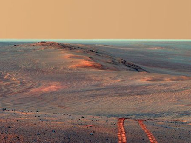 Dari foto yang beredar yang diterima NASA, Callas mengatakan di bagian sisi kanan bisa kelihatan tepi kawah Endeavour dari kejauhan. Lalu di bagian kiri, jalur rover Opportunity tampak menurun seperti lereng.