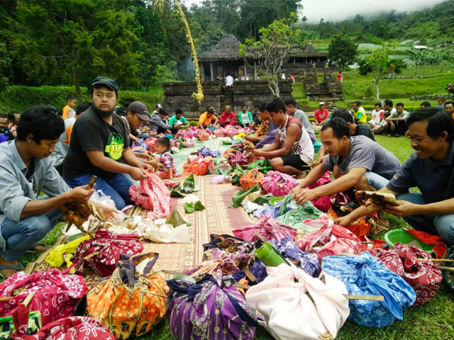Hari Minggu Pon, masing-masing warga mulai bergotong royong mempersiapkan bahan-bahan yang akan digunakan untuk sesajen, seperti beras, kambing, ayam, dan lainnya. Hari berikutnya, Senin Wage, warga setempat telah mempersiapkan sesajen dan mengumpulkannya di rumah sesepuh adat.