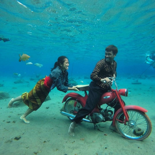 Selain spot fotonya sendiri, beberapa objek foto yang mesti menemani lo juga harusnya unik nih. Seperti berpose layaknya tengah menggunakan laptop tetapi tengah di dalam air, wah unik! Atau berpose tengah mengendarai motor di dalam air juga!