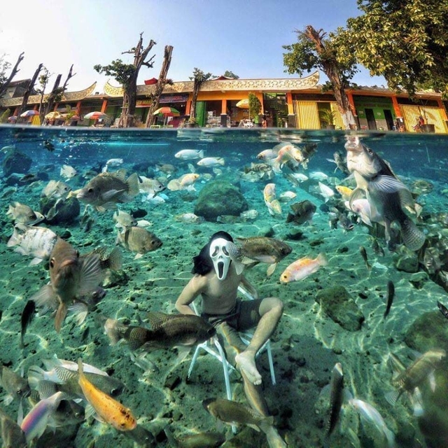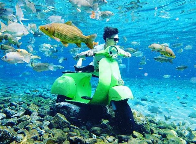 Umbul Ponggok merupakan spot petualangan yang unik. Pasalnya, spot foto underwater yang dimaksud bukan seperti spot foto lainnya yang alami. Di Umbul Ponggok, lo bisa menyewa set-set objek foto yang unik seperti bangku dan meja, laptop, bahkan ada sepeda motor yang bisa dimasukan ke dalam air.