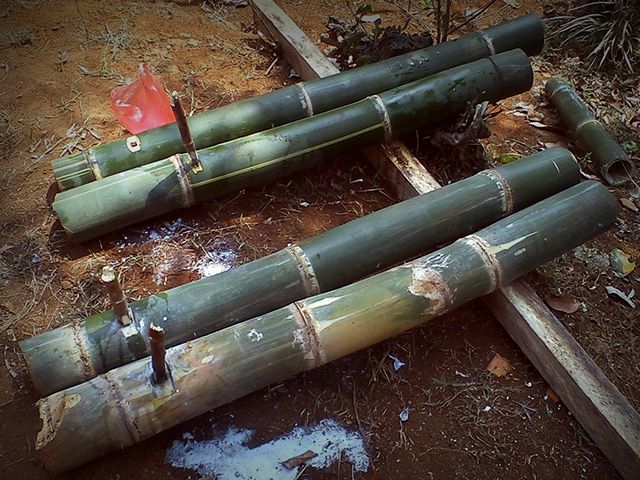 Setelah bambu terlihat bersih, lo bisa potong bambu dengan panjang sekitar 1,5 sampai 4 meter dengan diameter bambu sekitar 10 sampai 15 cm. Beri lubang kira-kira sebesar ibu jari, 10 cm dekat pangkal bambu. Lubang inilah tempat menyulut api untuk meledakan lodong. Lubangi tiap ruas bambu dengan linggis, pastikan setiap ruas mempunyai lubang yang rata kecuali pangkal bambu dekat tempat menyulut api.