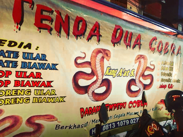 Di Jl. Mangga Besar Raya No. 93C, Mangga Besar, Jakarta Barat, ada warung yang nggak jauh berbeda dengan yang ada di Tangerang sebelumnya. Adalah King Cobra yang menyediakan menu sangat beragam. Mulai dari Sate, Sop, Empedu, Tangkur, hingga Abon yang terbuat dari ular dan juga biawak.
