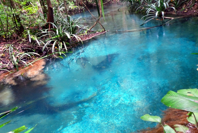 Jika banyak petualang yang asyik berpetualang di pantai dan lautan Raja Ampat, sebenarnya sedikit rugi jika tidak datang ke spot petualangan ini. Kalibiru adalah sebuah harta karun yang tersimpan dengan rapi. Kalibiru adalah sebuah sungai yang airnya benar-benar sebening kaca dan sebiru lautan.