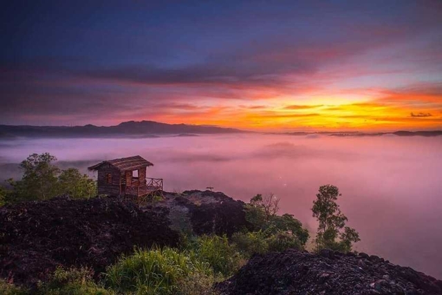 Salah satu faktor yang berpengaruh terhadap baik buruknya foto sunrise adalah lokasi memotret. Di Gunung Ireng, lo bisa menemukan spot berfoto terbaik berupa gubug kayu sederhana. Melalui latar belakang lautan kabut yang cantik, wisatawan bisa membuat obyek foto nampak berada di atas awan. Mantap sekali, bukan?