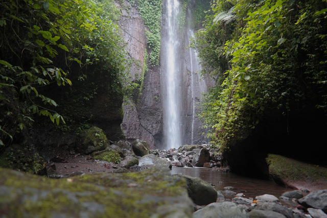 Lebar sungai yang akan lo telusuri kurang lebih 3-4 meter saja. Lo tidak bisa memilih untuk tetap berjalan di tepian sungai, karena sisi sungai ini dipenuhi oleh tebing terjal. Licin dan penuh lumut, bisa-bisa lo terjungkal dan terbentur batuan cadas di bawahnya.