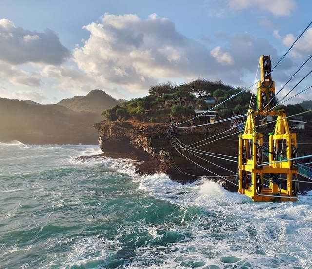 Terletak di Kabupaten Gunung Kidul, Yogyakarta. Di sana lo bisa naik sebuah kereta gantung yang ikonik loh. Bukan hanya sebuah kereta gantung yang biasa. Karena kereta gantung tersebut bisa mengantarkan lo ke batu karang yang ada di tengah laut.