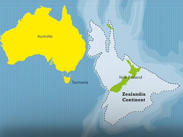 Akan tetapi, hanya 6 persen dari benua tersebut yang berada di atas permukaan laut. Bagian tersebut menopang pulau-pulau utara dan selatan Selandia Baru, serta Pulau Kaledonia Baru. Sisanya, sebagian besar daratan benua ini di bawah air, yang membuat orang-orang Selandia Baru sulit untuk menelitinya.